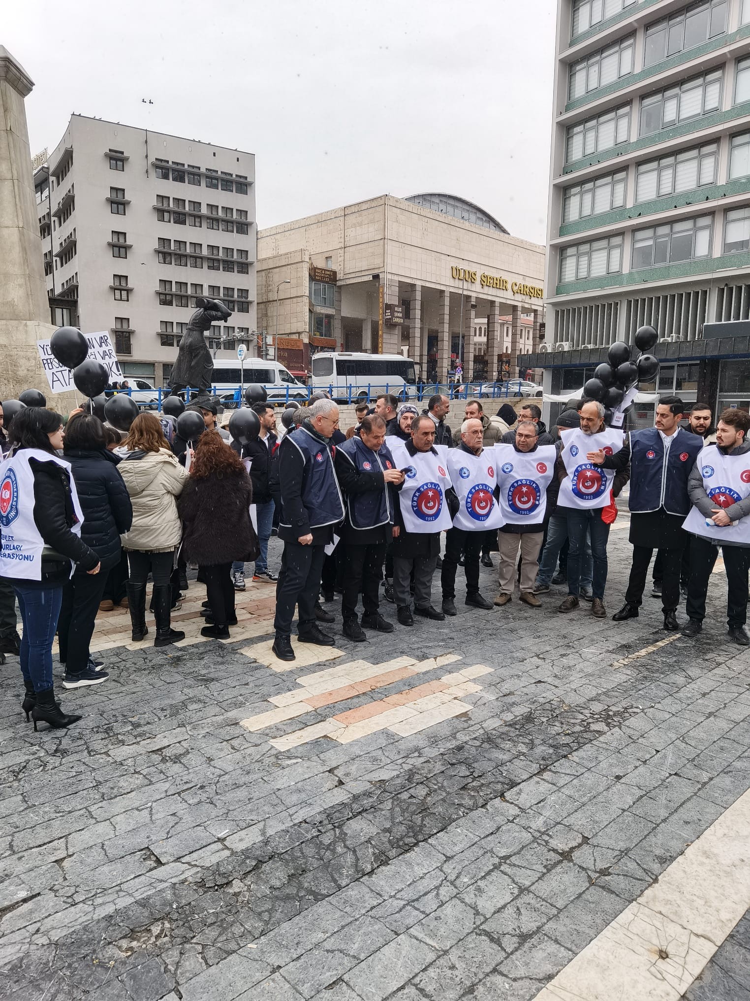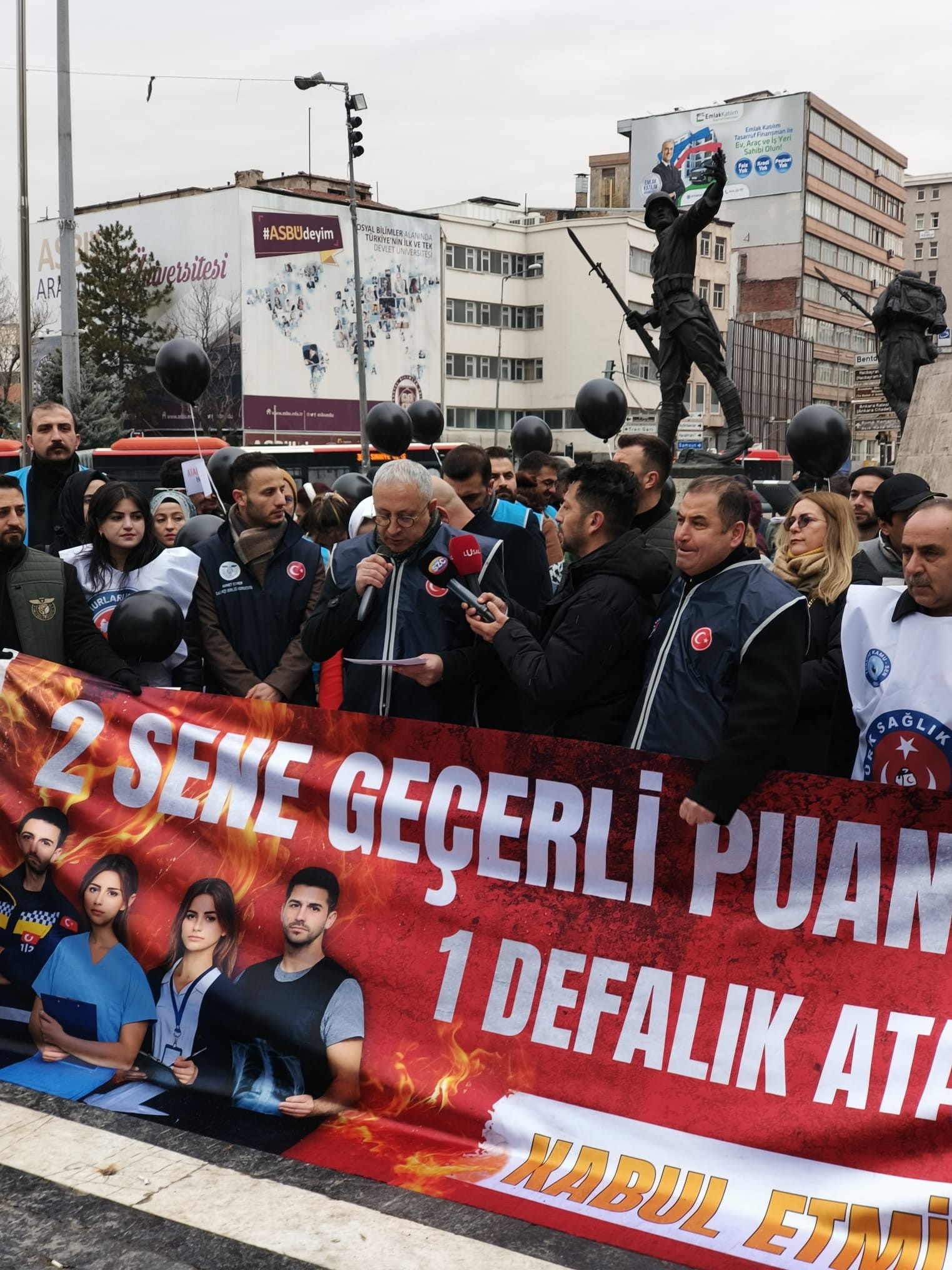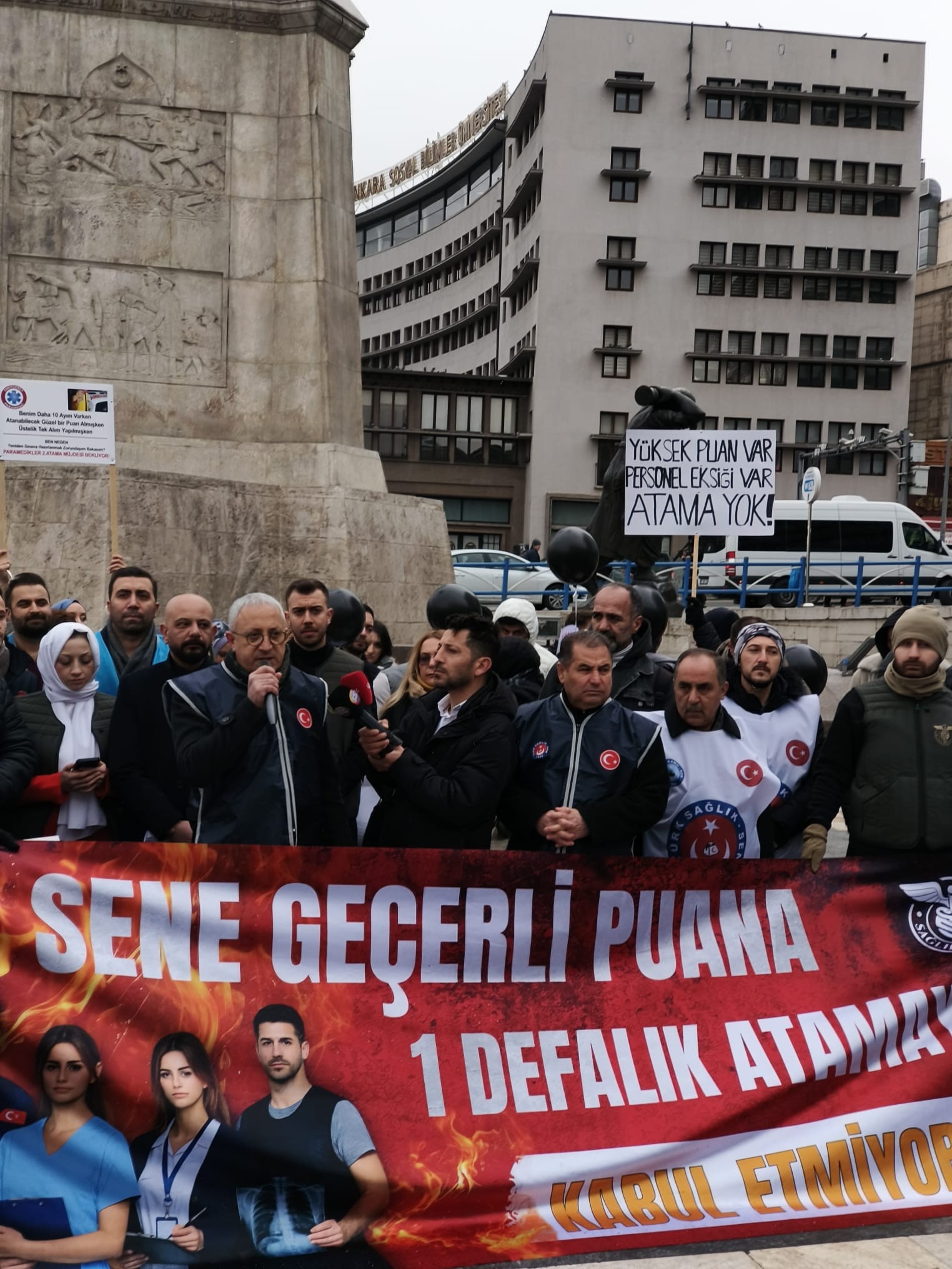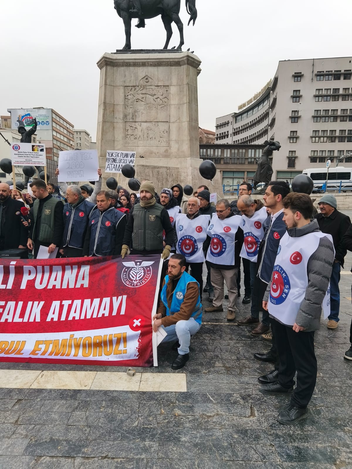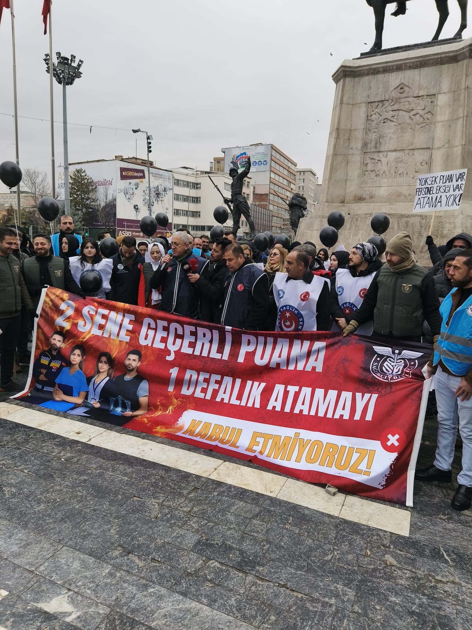 Genel Başkan Yardımcılarımız Mücahit Gökhan Şahin ve Kemal Kazak, Ankara şube başkanlarımız ve şube başkan yardımcılarımız katıldığı ve atama bekleyen genç sağlık çalışanlarının balon uçurup, diploma yırttığı açıklamada Genel Başkan Yardımcımız Mücahit Gökhan Şahin’de bir konuşma yaptı.
