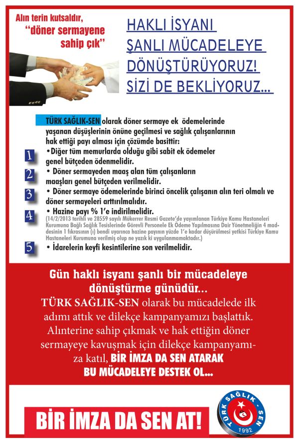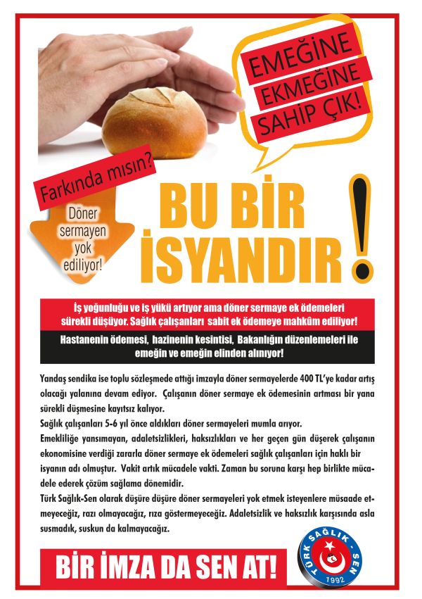 Her geçen gün hastanelerde iş yoğunluğu artarken, hastanenin ödemesi, yandaş sendikanın teslimiyeti, hazinenin kesintisi, Bakanlığın düzenlemeleri diyerek döner sermayen yok edilip sabit ek ödemeye mahküm ettiler!