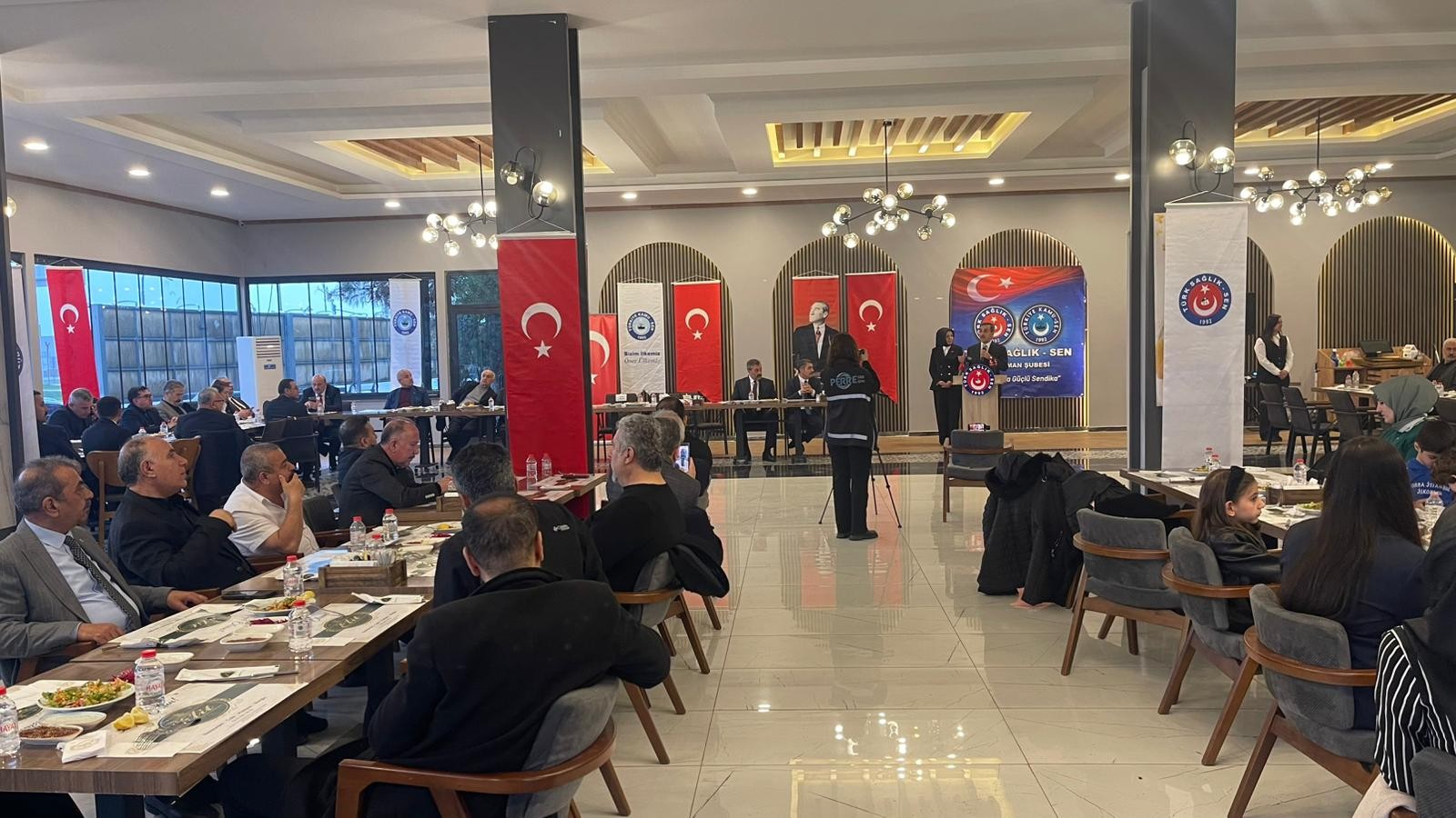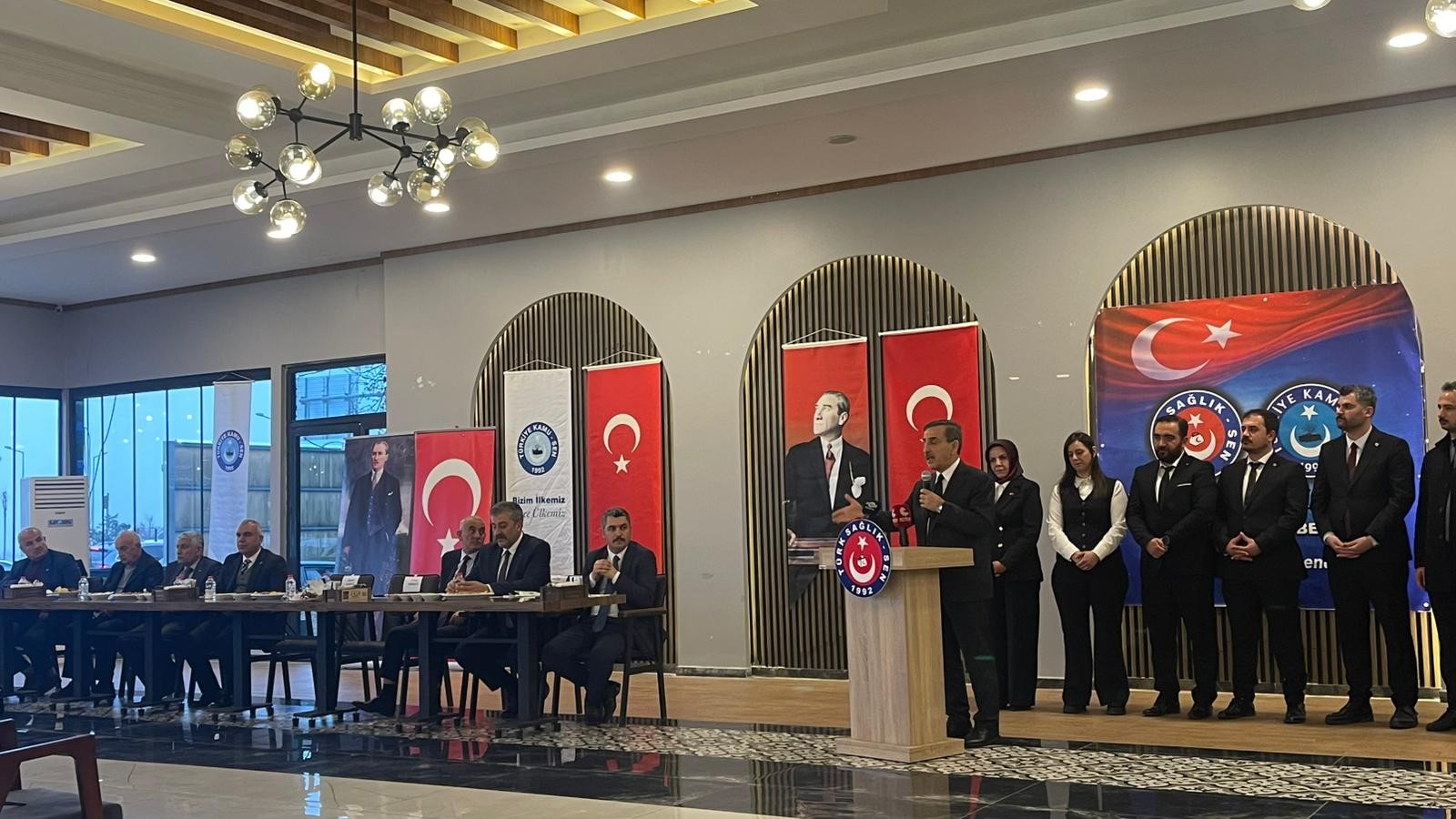 Açılışın ardından Adıyaman Şubemiz tarafından gerçekleştirilen işyeri temsilcileri toplantısına katılımı sağlandı. Şube Başkanımız Fidan Karakuş’un yaptığı açılış konuşmasının ardından kürsüye gelen Genel Başkanımız Önder Kahveci Sağlık ve kamu çalışma hayatı ile ilgili değerlendirmelerde bulundu. Genel Başkanımız konuşmasında sahada büyük bir özveriyle mücadele eden tüm teşkilatımıza teşekkür ederek, sözlerini şöyle tamamladı: “Mücadeleye ve çalışmaya devam dedik. İnanıyorum ki teşkilatımızın her bir ferdinin ortaya koyduğu gayret ve çalışkanlık, ailemizi daha da büyütecektir. Sendikamız için her zaman ve her şartta gece gündüz demeden mücadelemizi hep birlikte sürdüreceğiz. Bu anlamlı toplantıda bizleri Adıyaman teşkilatımızla bir araya getiren Şube Başkanımız Fidan Karakuş’a ve şube yöneticilerimize teşekkür ediyor, sendikal çalışmalarında başarı ve kolaylıklar diliyorum."