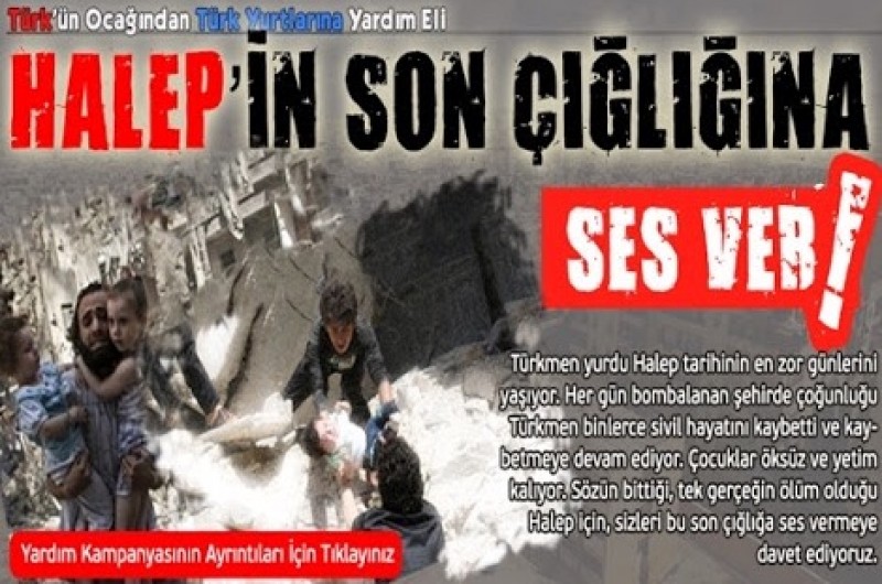 Türkmen yurdu Halep tarihinin en zor günlerini yaşarken, Türk Ocakları Genel Merkezi başta Halep olmak üzere Suriye'de hayatta kalma mücadelesi veren soydaşlarımıza yönelik 'HALEP'İN SON ÇIĞLIĞINA SES VER!' adı altında bir kampanya başlattı.