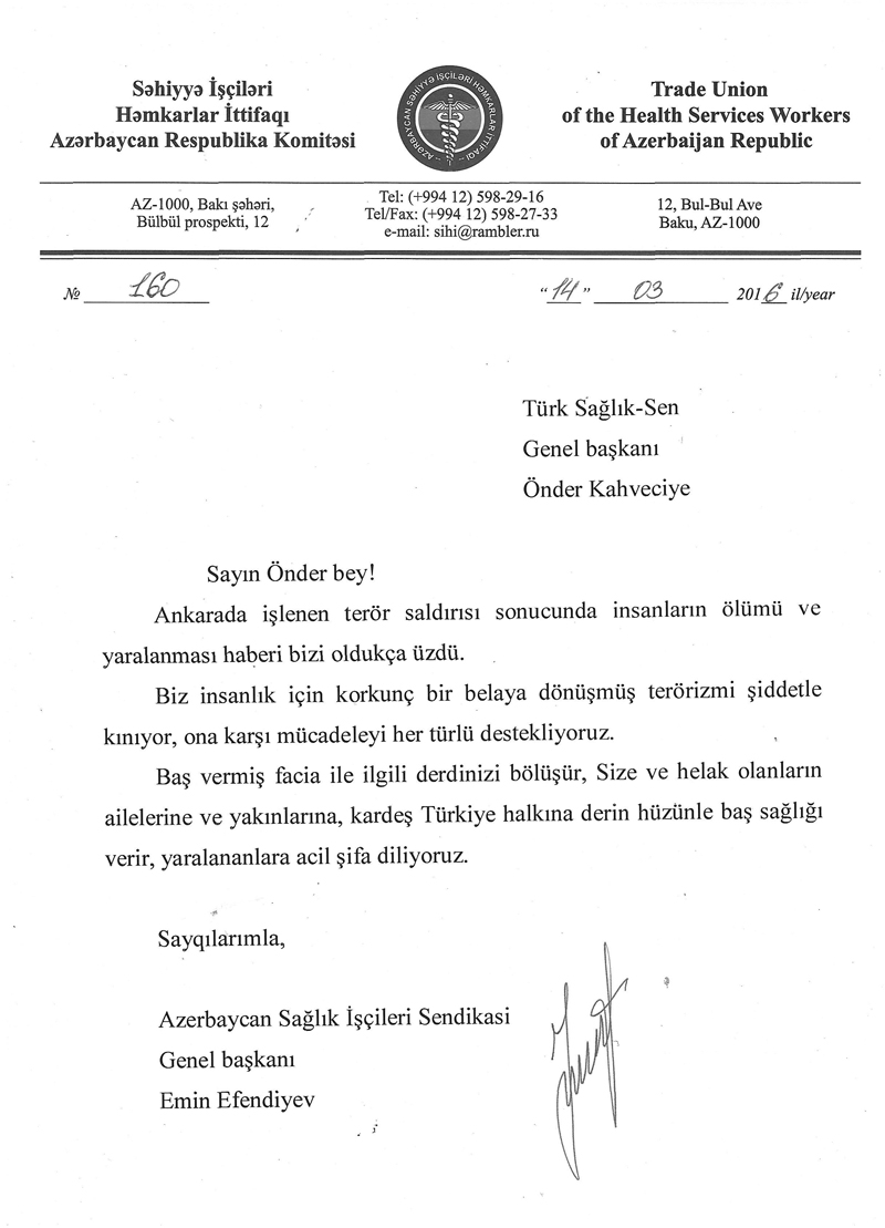 Ankara’da yaşanan hain terör saldırısı nedeniyle Azerbaycan Sıhhiye İşçileri Sendikası Genel Başkanı Emin Efendiyev, Genel Başkanımız Önder Kahveci’ye taziye mektubu gönderdi.