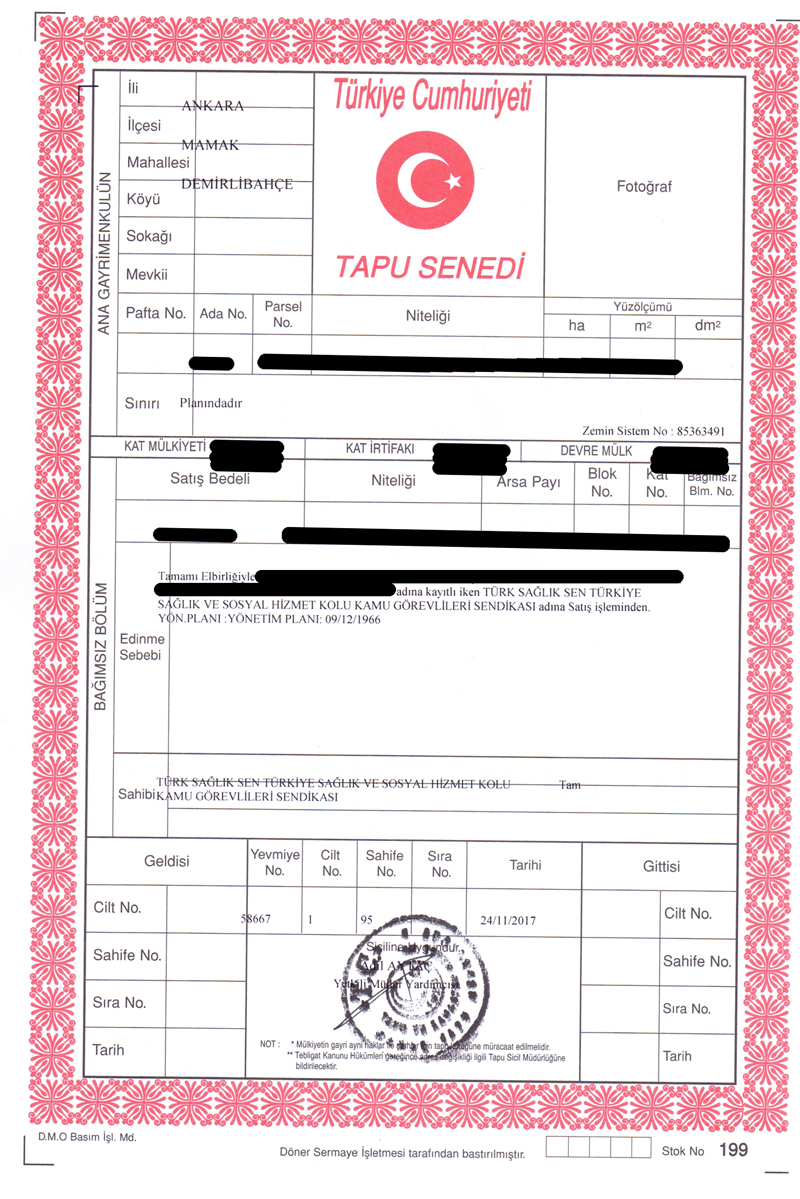 Tapu Müdürlüğünde devir işleminin tamamlanmasının ardından bir değerlendirme yapan Genel Başkanımız Önder Kahveci “Türk Sağlık-Sen olarak üyelerimize karşı sosyal sorumluluğumuz olduğu bilinciyle hareket ediyor ve buna uygun olarak hizmet etmek için uğraşıyoruz. Bu anlamda sendikamız için önemli bir projenin en önemli adımını atarak misafirhanemizin arsasını aldık. Çok kısa bir süre içerisinde mimari projesini de hazırlatarak temeli atacağız. Misafirhanemizi en kısa sürede tamamlayarak üyelerimizin hizmetine sunacağımızdan herkes emin olsun. Sendikamıza yakın ve Ankara’da merkezi bir konuma sahip misafirhanemizle üyelerimize çok önemli bir hizmeti sunmuş olacağız. Teşkilatımıza ve üyelerimize hayırlı uğurlu olsun' dedi.