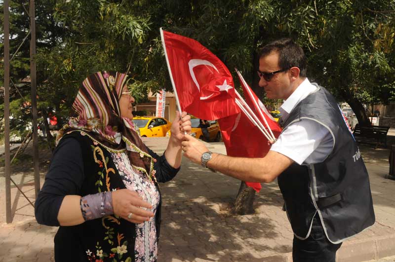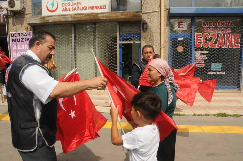 Okunan Kuran-ı Kerim’in ardından yürüyüşe geçen kalabalık, esnaf ve vatandaşlara Türk bayrağı dağıttı.