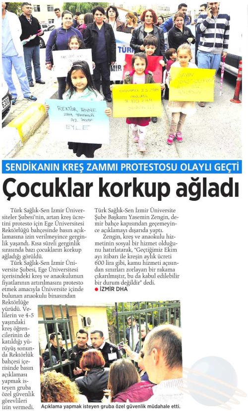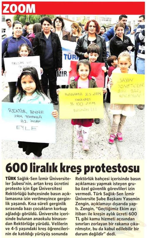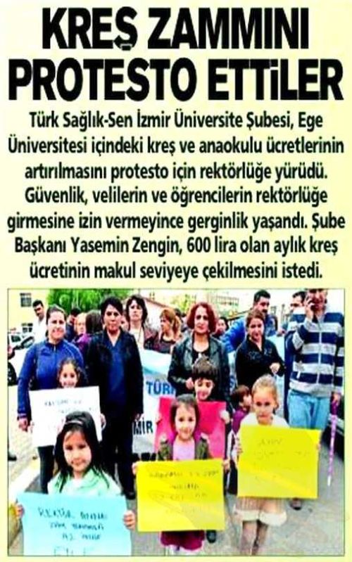 23.11.2015 Tarihinde Kreş ve Anaokulları ücretlerine gelen fahiş zam oranına tepki ve ücretlerin geri çekilmesini talep etmek üzere Kreş ve Anaokulları önünde saat12.00’da velilerle toplanarak Rektörlüğe yürüdük. Saat 12.30’da Rektörlük önünde basın açıklaması yaptık. Kreş ve Anaokulları ücretleri veliler için makul orana çekilene kadar mücadelemize devam edeceğiz.