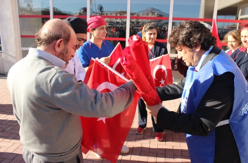 Şube Başkanımız Turgay Çetin, hastaneye muayene olmak veya hasta ziyaret etmek üzere gelen vatandaşlarımıza Türk Bayrağı dağıttı. Vatandaşlarımızın da büyük ilgi gösterdiği Türk Bayrağı dağıtımından sonra eylemimize geçilerek, yaşanan terör olayları protesto edildi. Terör olaylarını gerçekleşrirenler ve destek verenler lanetlendi.
