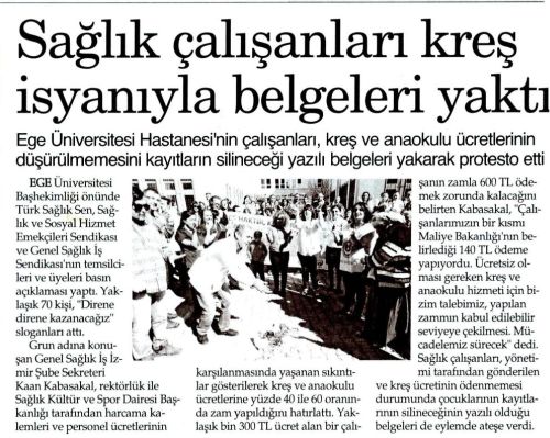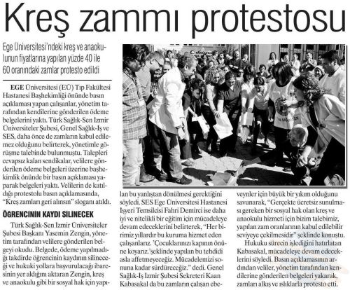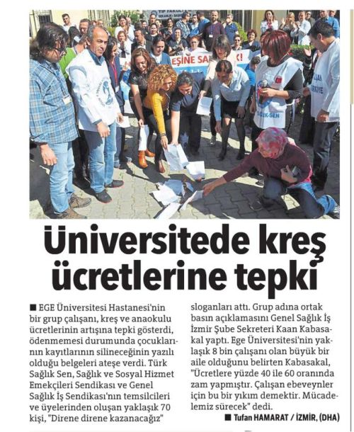 Ege Üniversitesi Hastanesi bünyesinde hizmet veren Anaokulları ve Kreş ücretlerinde Ekim ayından itibaren yaşanan sorunların giderilmemesi, Rektörlük makamının görüşme ve ücretlerin makul orana çekilmesi taleplerimize cevap vermemesi, velilere ücretleri yatırın yoksa sizi icraya veririz yada çocuğunuzun kaydını sileriz talepli yazıları üzerine 23.03.2016 tarihinde Başhekimlik önünde Sendikalar olarak basın açıklaması yaptık.