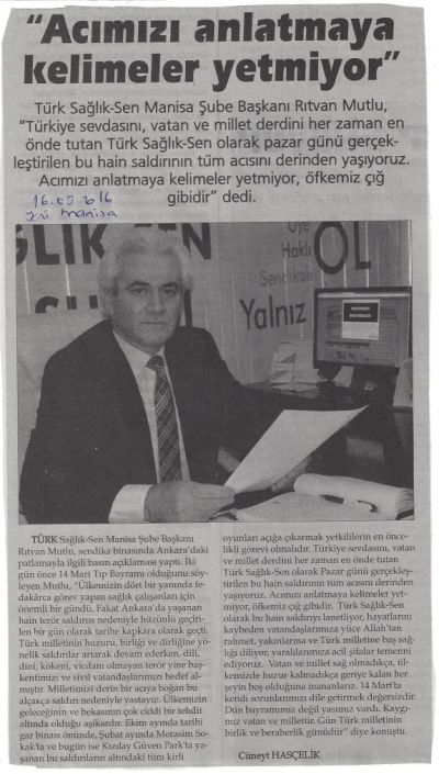 Türk Sağlık-Sen Manisa Şube Başkanı Rıtvan Mutlu 13 Mart Pazar günü Ankara'da gerçekleşen kanlı teröre tepki verdi.Biliyorsunuz dün 14 Mart Tıp Bayramıydı.