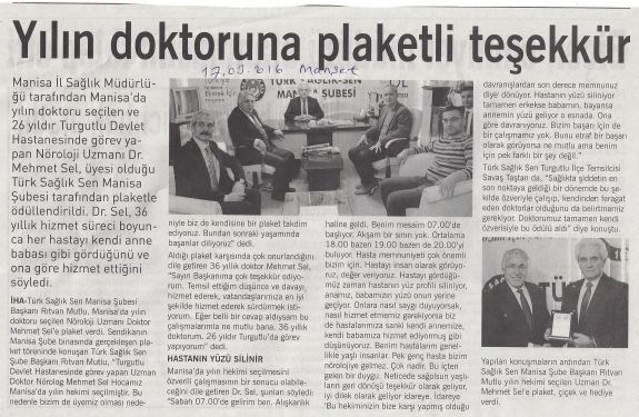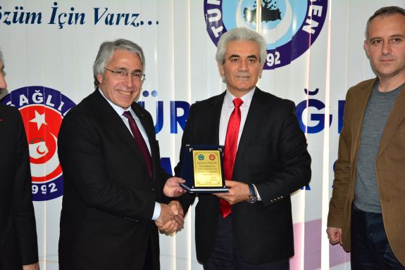 Manisa İl Sağlık Müdürlüğü tarafından düzenlenen ve yılın doktoru seçilen Nöroloji Uzmanı Doktor Mehmet Sel’e üyesi olduğu Türk Sağlık Sen’den de plaket aldı.
