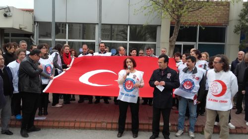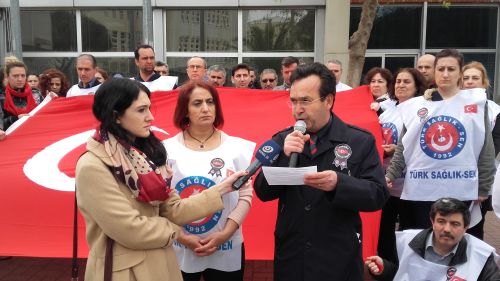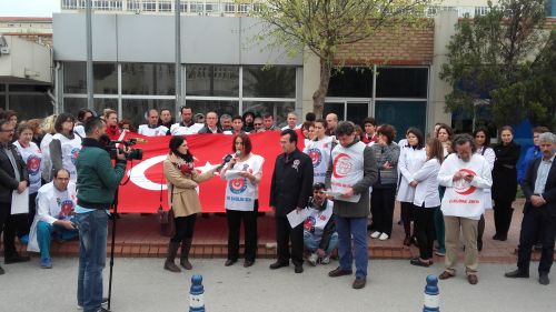 Basın Açıklamamıza Genel Sağlık İş’ten ve İzmir Tabip Odası’ndan da destek geldi. İzmit Tabip Odası adına Ege Üniversitesi Mikrobiyoloji Anabilim Dalı Öğretim görevlimiz Prof. Dr. Ramazan İnci konuşma yaptı. Genel Sağlık İş adına Kaan Kabasakal bir konuşma gerçekleştirdi.