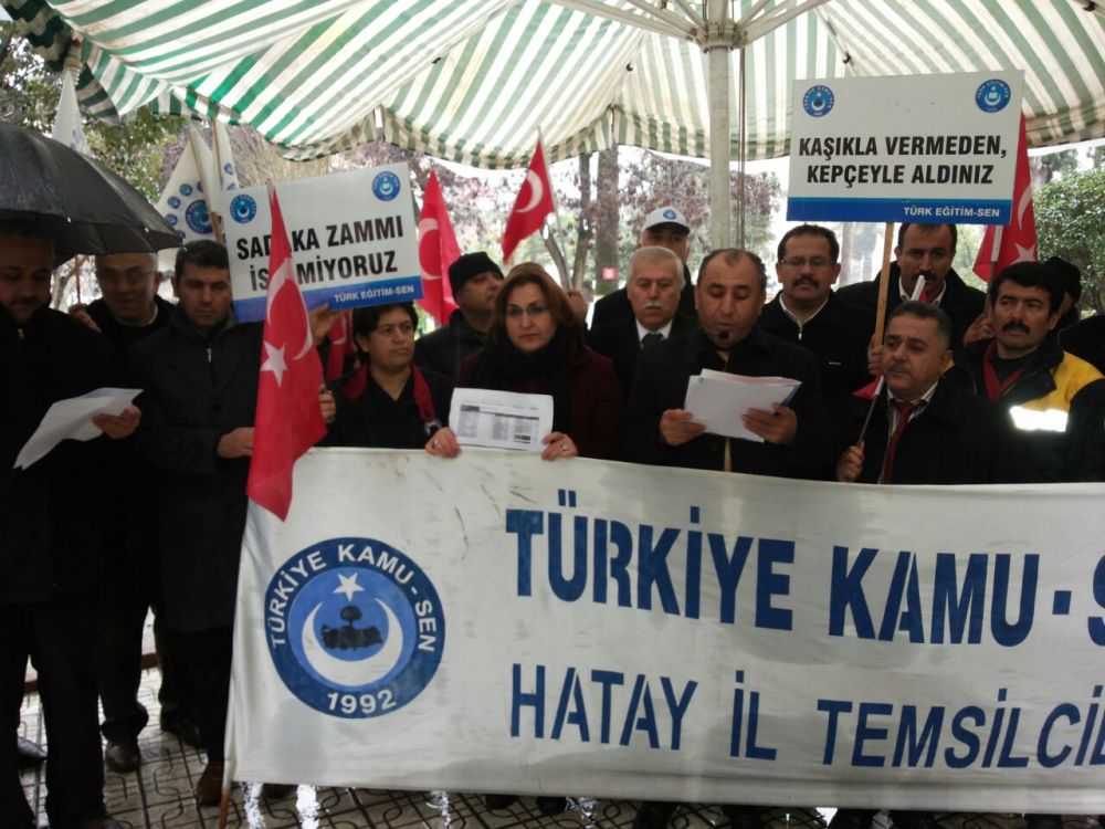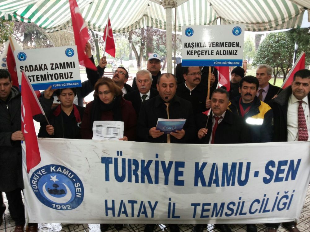 Memuru, emekliyi enflasyona ezdiren, ek zam talebimizi görmezden gelen, memura 2015 yılında 3%+3% zammı reva gören iktidarı protesto etmek amaçlı bordro yakma eylemizi Türkiye Kamu Sen Hatay İl Temsilcisi ve Türk Sağlık-Sen Hatay Şubesi Yönetim Kurulu Başkanı Sayın Hayrettin ŞAHİN önderliğinde Hatay ili tüm sendika şube başkanlarımız ve sendikalarımıza bağlı üyelerimizin katılımlarıyla Tüm Türkiye'de eş zamanlı olarak Hatay ili merkez ilçesi Antakya'da gerçekleştirmiş bulunmaktayız.
