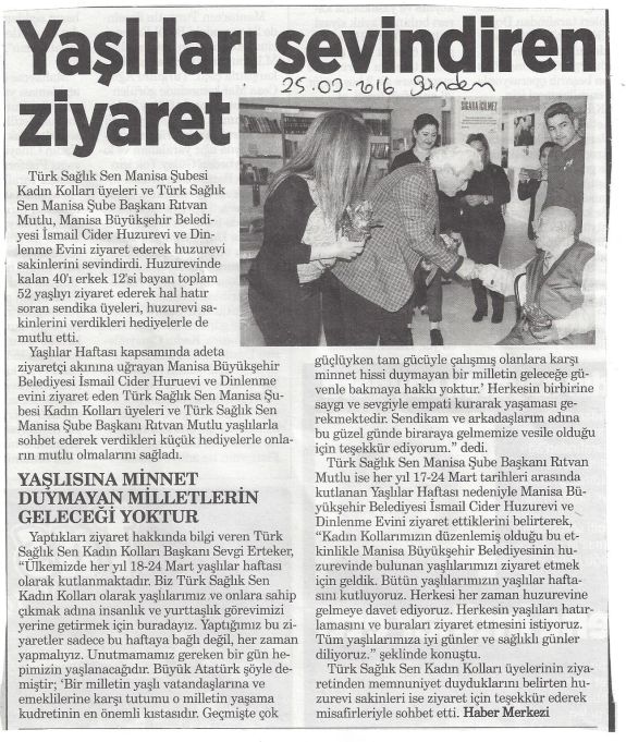 Türk sağlık Sen Manisa Şubesi Kadın Kolları üyeleri ve Türk Sağlık Sen Manisa Şube Başkanı Rıtvan Mutlu, Manisa Büyükşehir Belediyesi İsmail Cider Huzurevi ve Dinlenme Evini ziyaret ederek huzurevi sakinlerini sevindirdi.