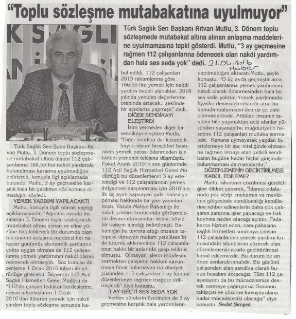 Ağustos ayında imzalanan 3. Dönem toplu sözleşmede mutabakat altına alınan ve eline yüzüne bakılabilecek bir durumda olan tek önemli anlaşma maddesi her ne kadar günümüz ekonomik şartlarına çokta uygun olmasa da112 çalışanlarına yemek yardımının nakdi olarak ödenecek olmasıydı.