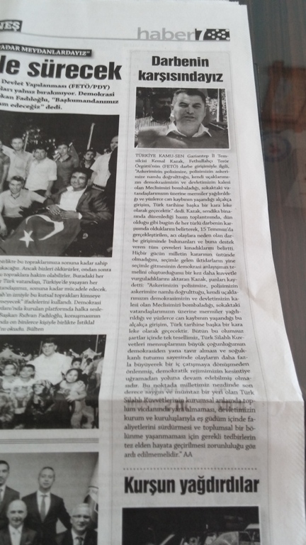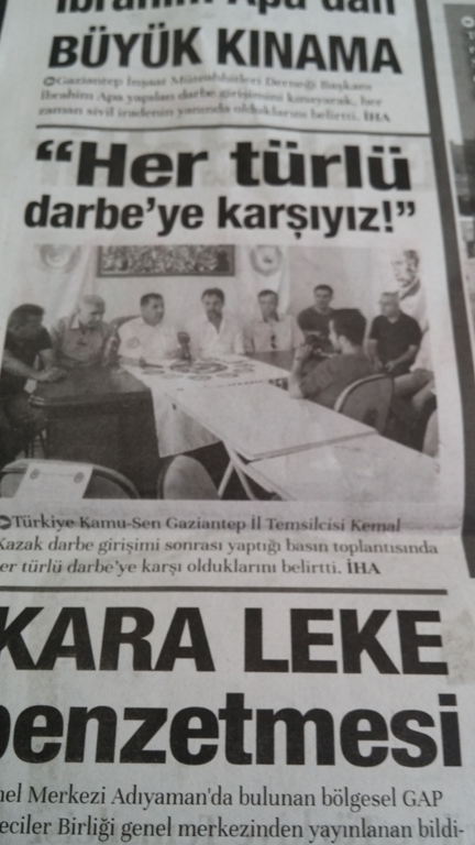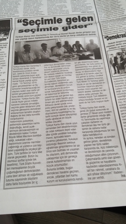 Türkiye Kamu-Sen Gaziantep İl Temsilciliği olarak; Darbe Teşebbüsünü protesto etmek için, Şehit Dr. Ersin Arslan toplantı salonunda basın açıklaması yaptık. İl Temsilcimiz Kemal KAZAK yaptığı açıklamada şu ifadelere yer verdi:
