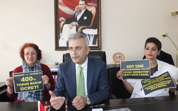 Çalışma Bakanı Torun bakan büyükannelere 400 TL. ücret ödemek için hazırlık yaparken Sağlık Bakanlığının süt izni kullanan annelerin Döner Sermayelerinden kesinti yapmasına Türk Sağlık Sen Kocaeli Şube Başkanı Ömer Çeker, Şube Başkan Yardımcısı Şengül Çakmak, Arif Ovalı, Hacer Gündüz, Büyükanne Hatice Yılmaz, Eski Şube Başkan Yardımcısı Erol Kalemer ile birlikte Şubede basın açıklaması yaptı.