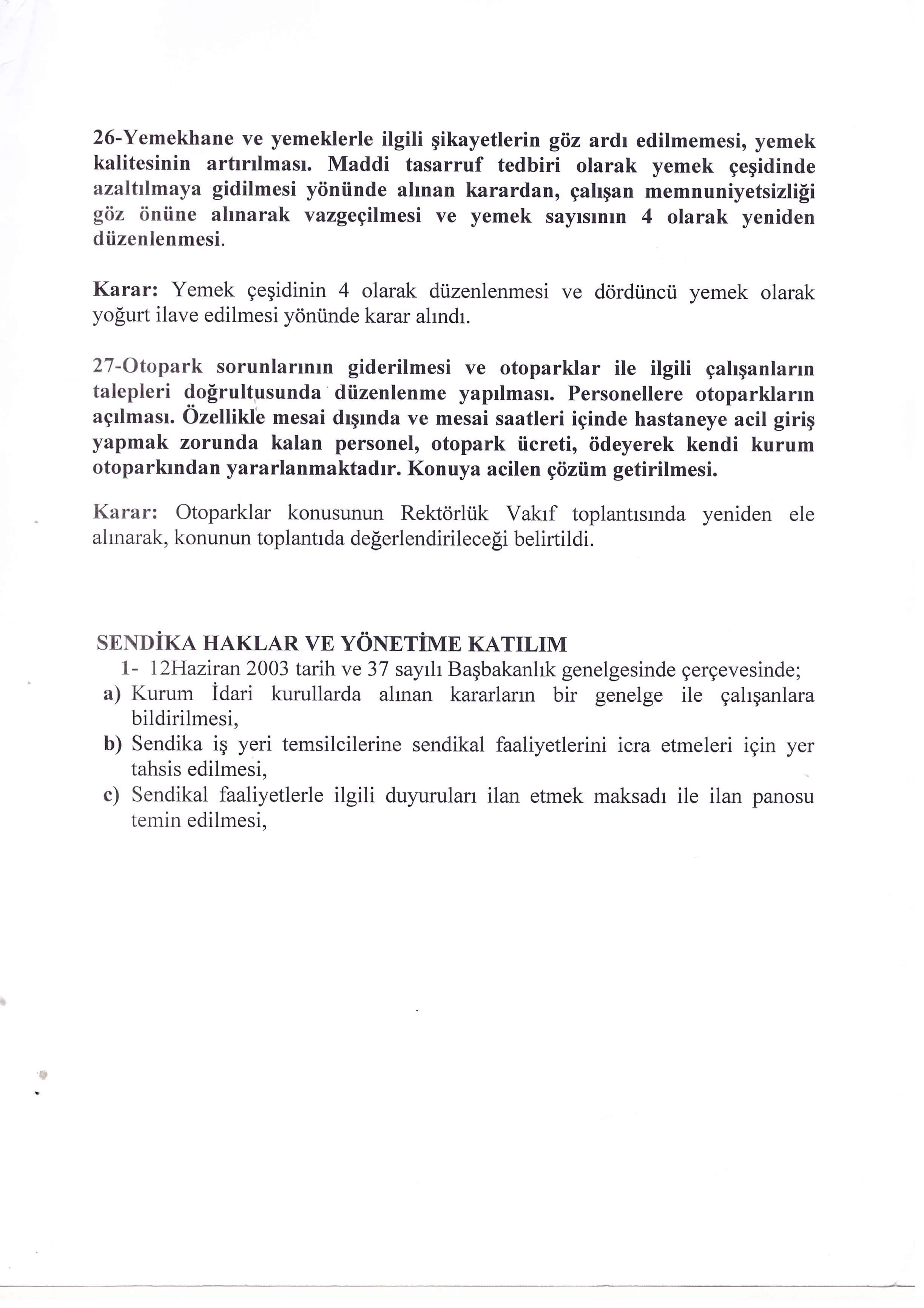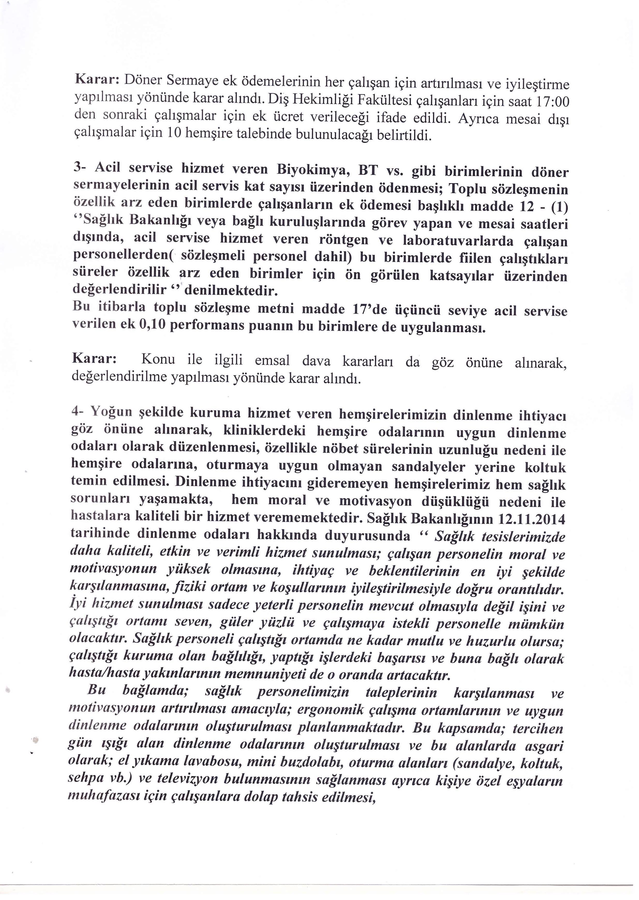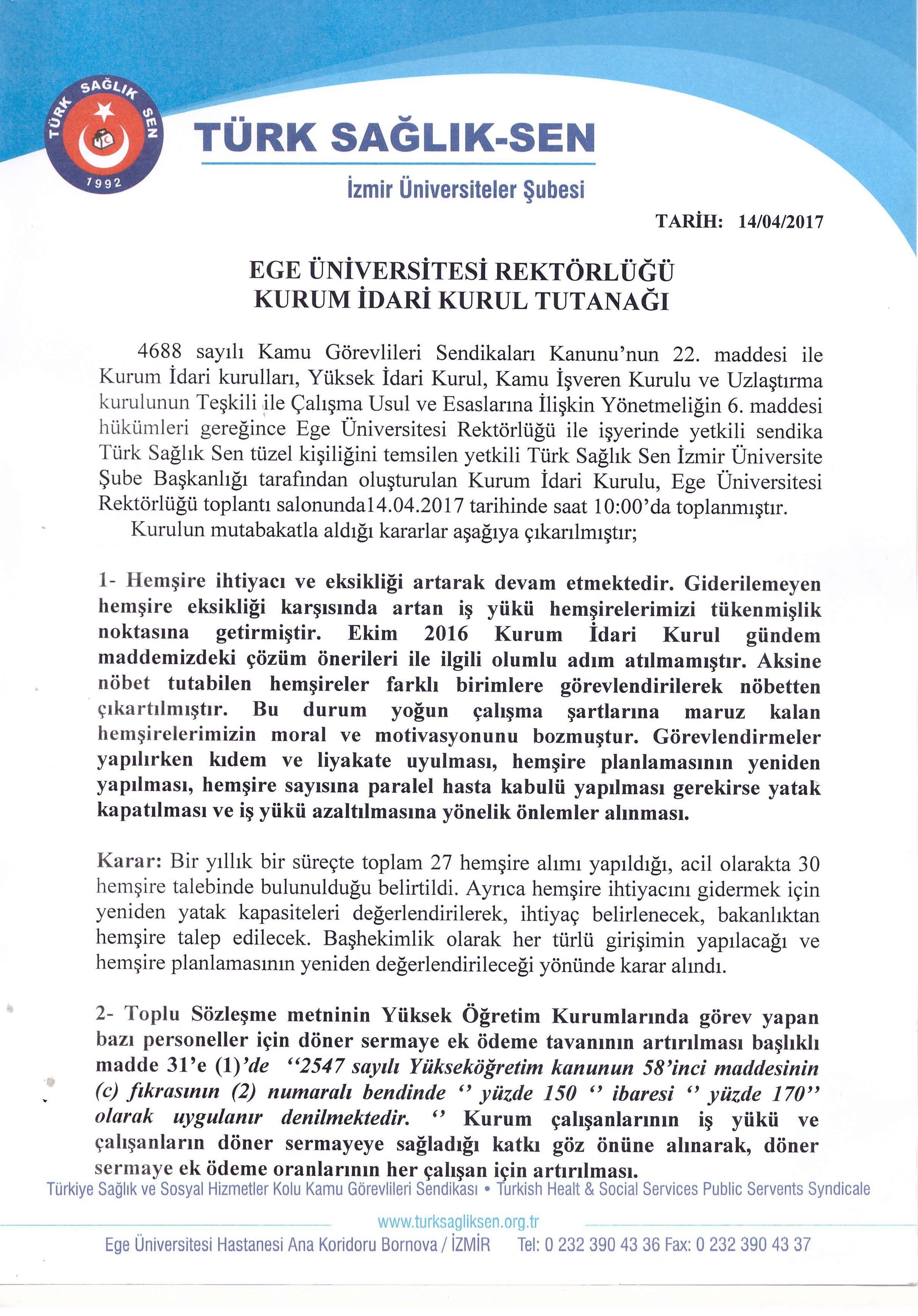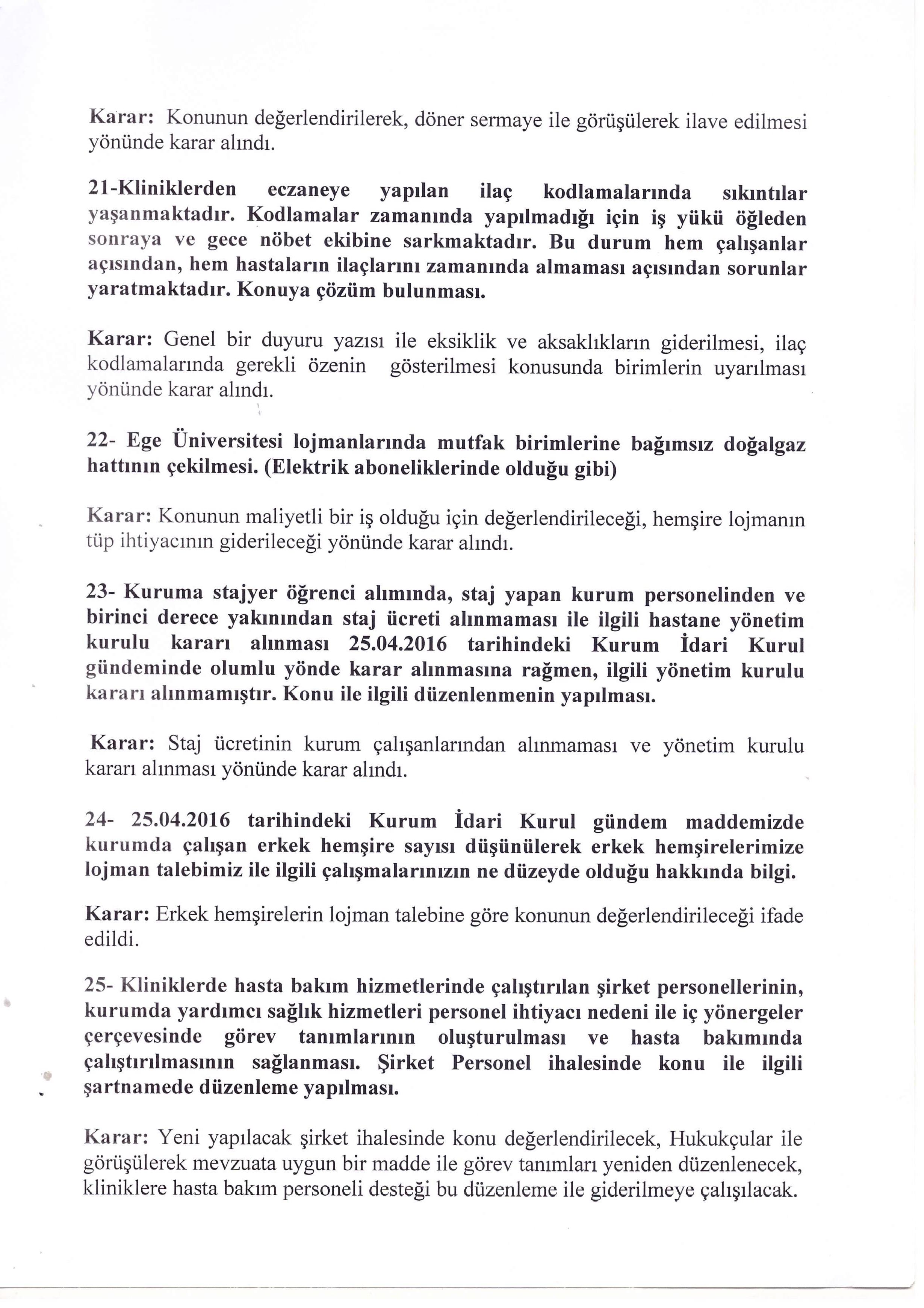 Ege Üniversitesi çalışanlarının mali, özlük ve sosyal haklarına ve sorunlarına yönelik tespit ettiğimiz sorunlar, çözüm önerilerimiz ve mutabakat altına alınan kararların takipçisi olacağımızı belirtiriz.Özellikle Döner Sermaye artışı konusunda, hemşire meslektaşlarımızın oda düzenlenmesi konusunda ve yemek çeşidinin 4 olarak düzenlenmesi konusunda olumlu yönde karar alan yönetimin hassasiyetine teşekkür ederiz. Çözüm noktasında diğer konuların takipçisi olacağız.