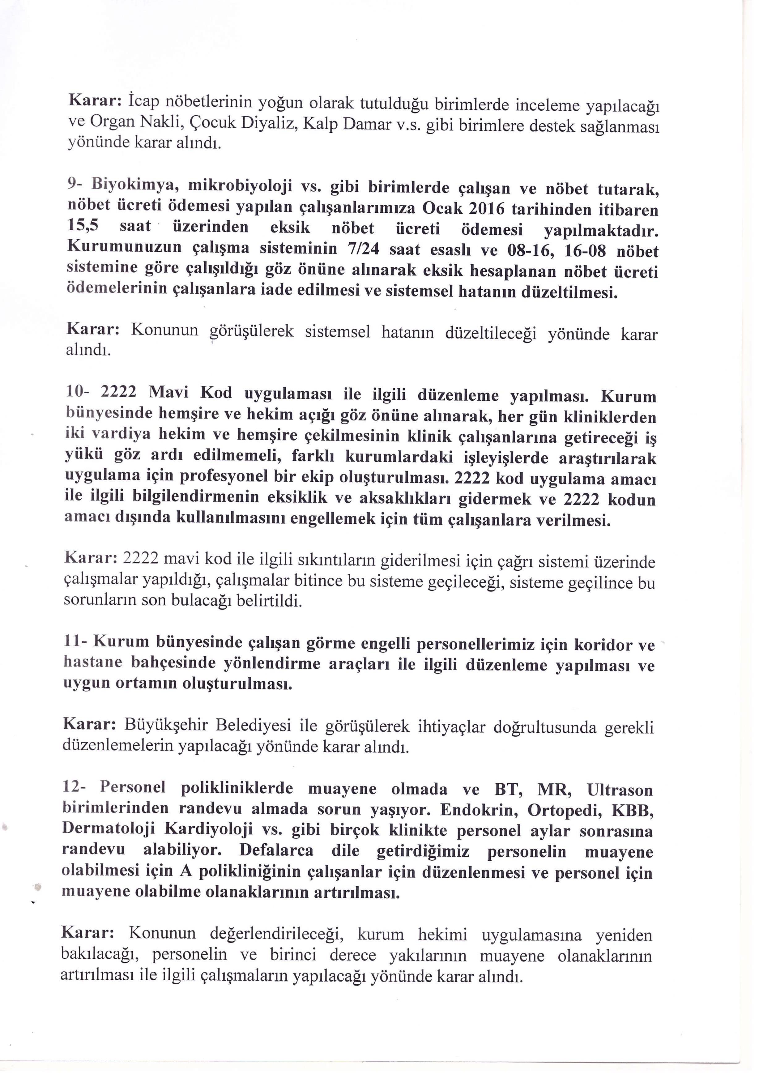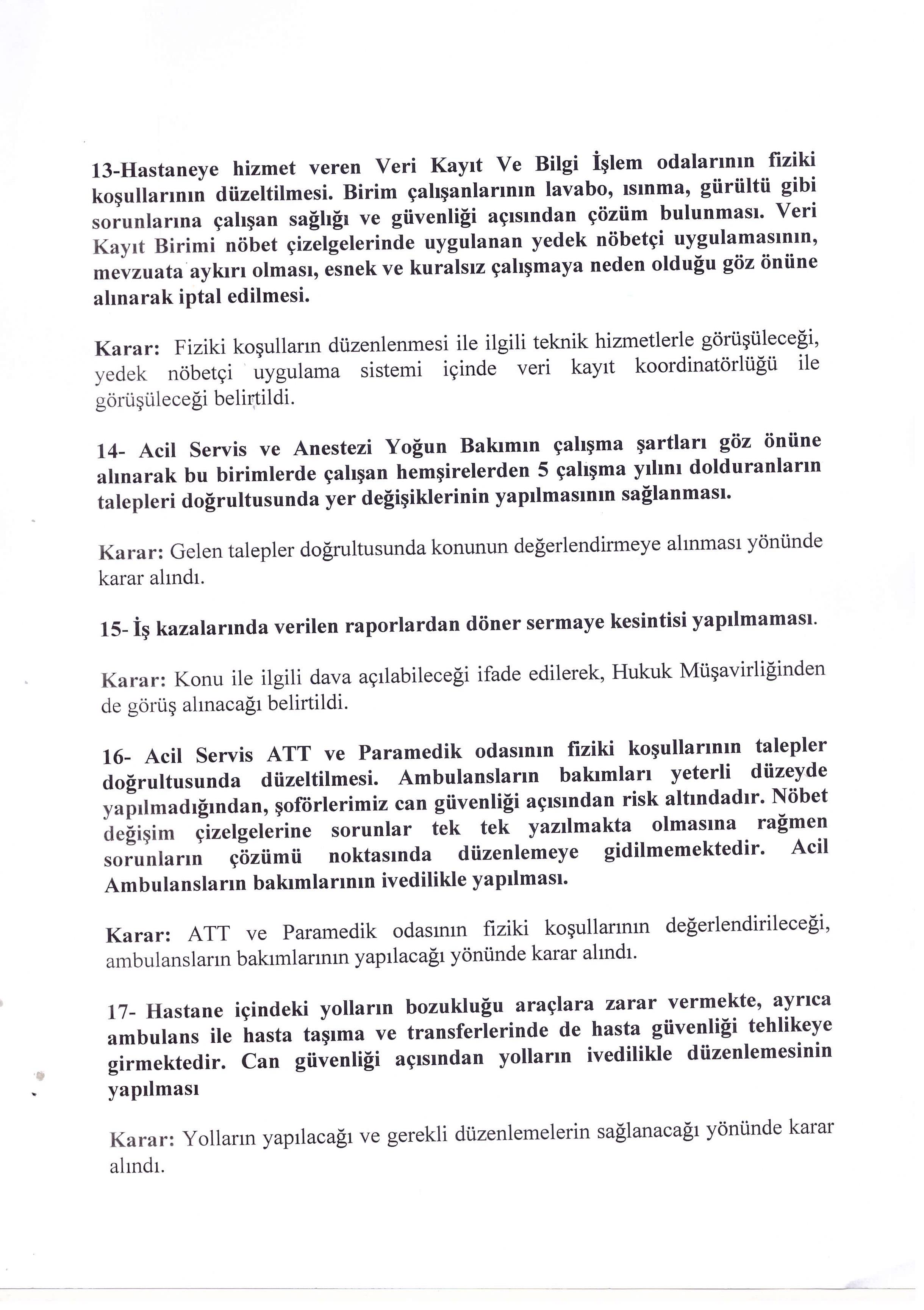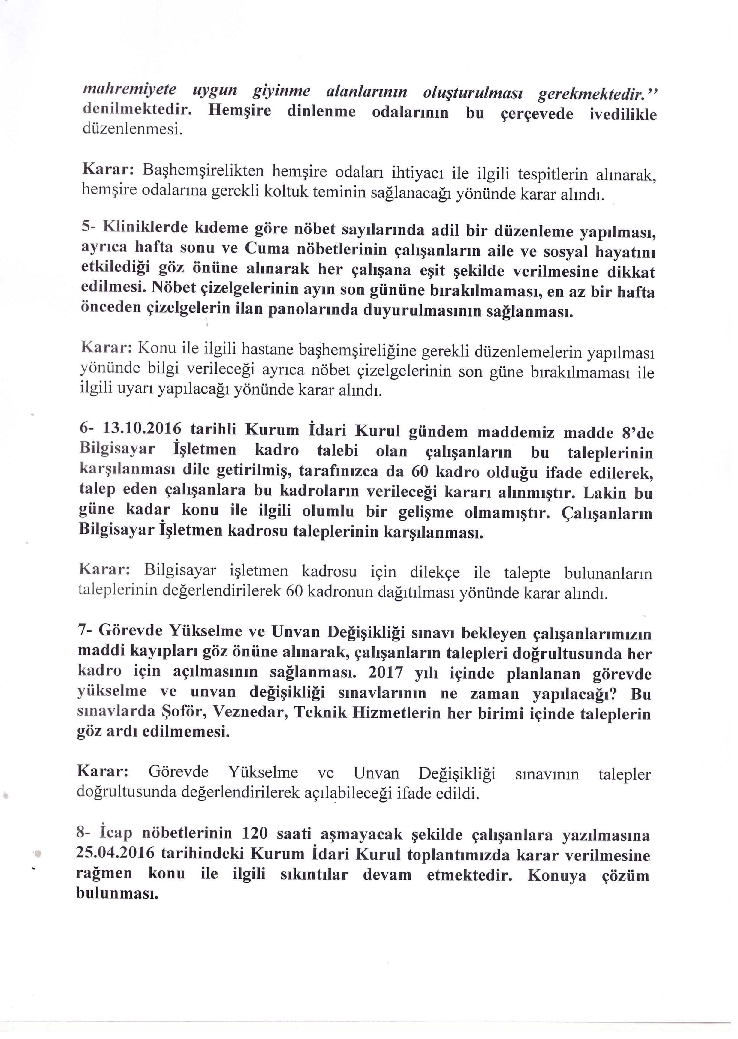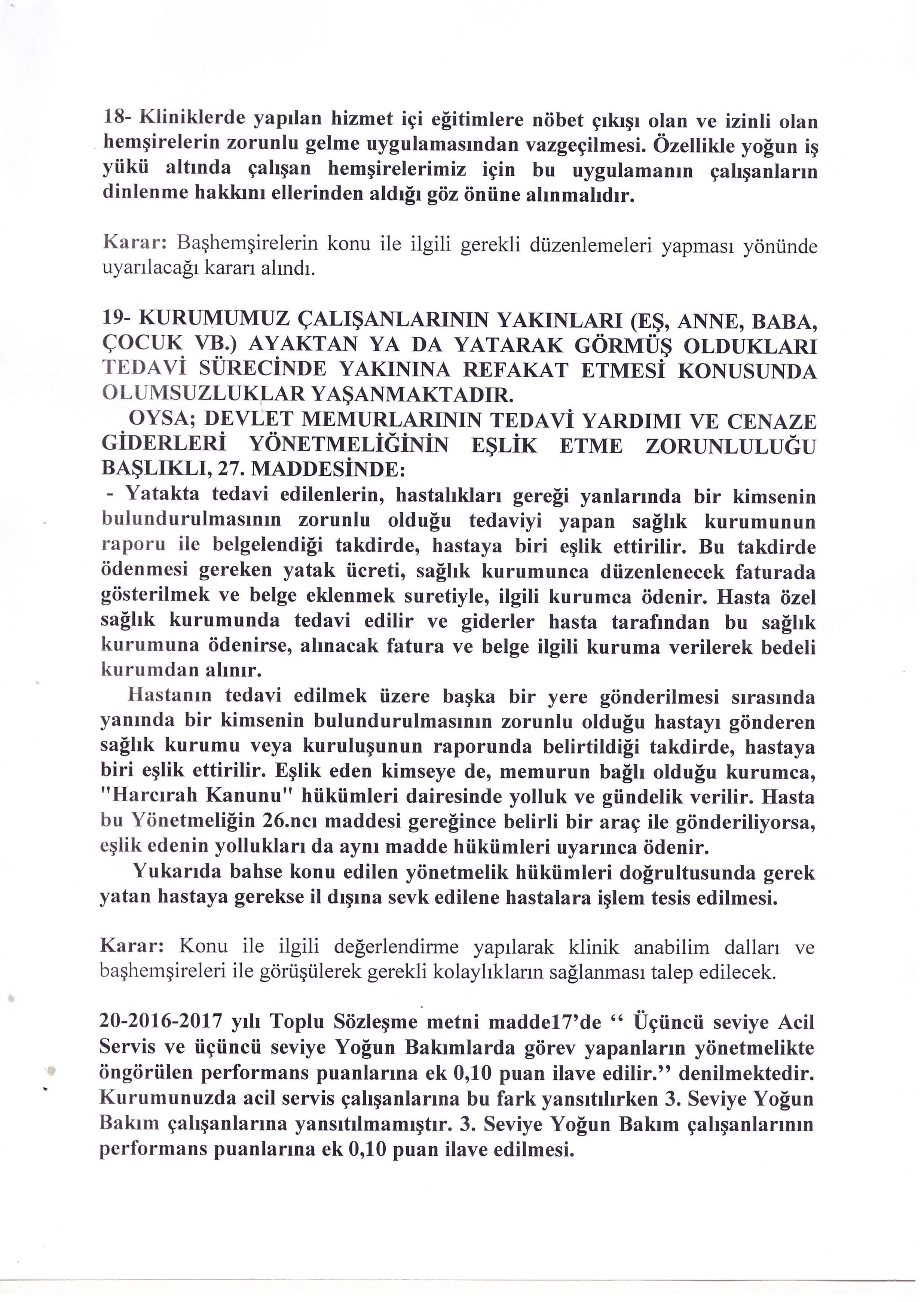 Ege Üniversitesi çalışanlarının mali, özlük ve sosyal haklarına ve sorunlarına yönelik tespit ettiğimiz sorunlar, çözüm önerilerimiz ve mutabakat altına alınan kararların takipçisi olacağımızı belirtiriz.Özellikle Döner Sermaye artışı konusunda, hemşire meslektaşlarımızın oda düzenlenmesi konusunda ve yemek çeşidinin 4 olarak düzenlenmesi konusunda olumlu yönde karar alan yönetimin hassasiyetine teşekkür ederiz. Çözüm noktasında diğer konuların takipçisi olacağız.