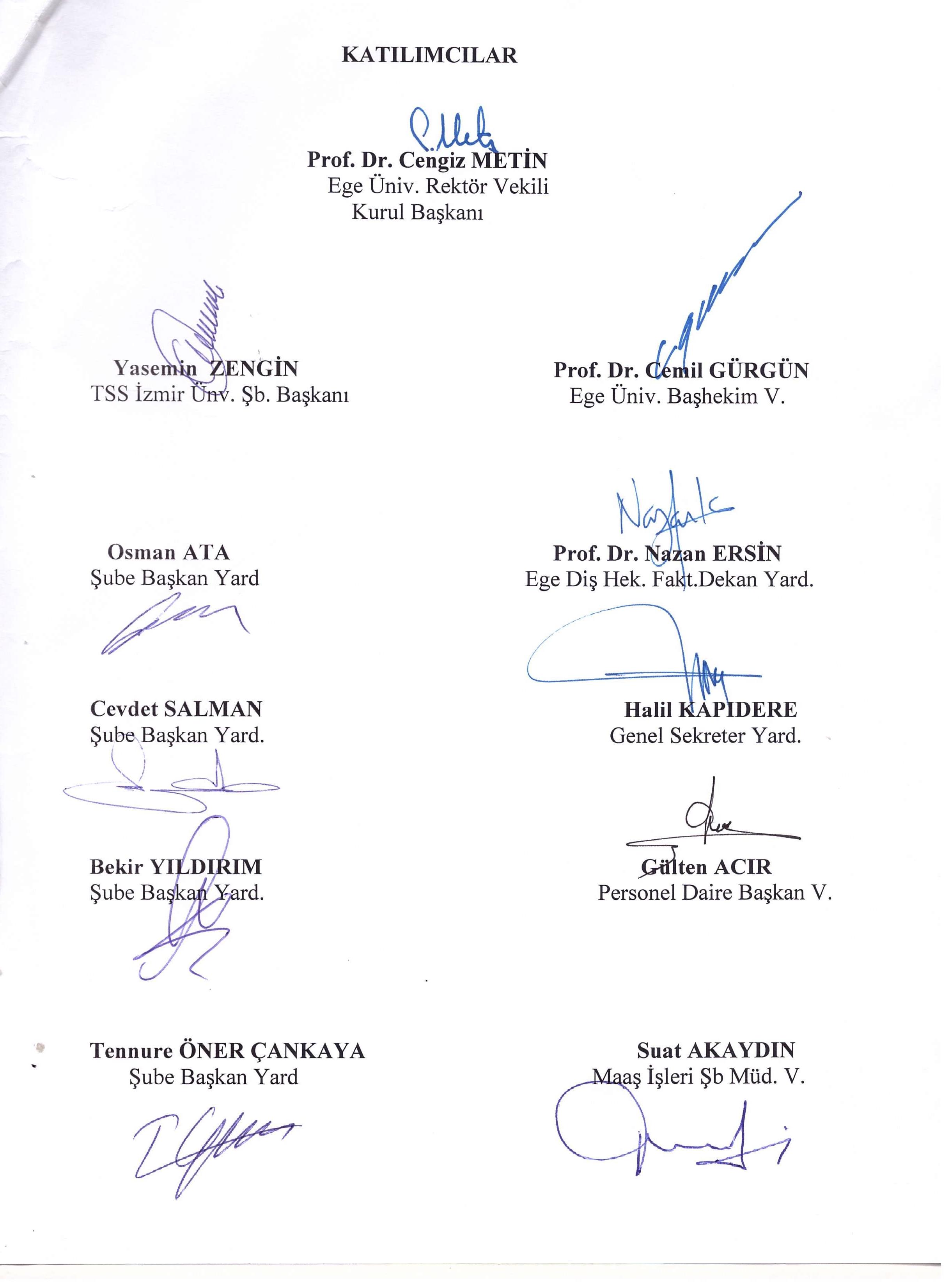 Ege Üniversitesi Rektörlüğü Toplantı salonunda geçen toplantıya tarafımızı temsilen Şube Başkanımız Yasemin ZENGİN, Şube Başkan Yardımcılarımız Osman ATA, Cevdet SALMAN, Bekir YILDIRIM, Tennure ÖNER ÇANKAYA, Rektörlük makamını temsilen Ege Üniversitesi Rektör Vekili Prof. Dr. Cengiz METİN, Ege Üniversitesi. Başhekim Vekili Prof. Dr. Cemil GÜRGÜN, Ege Diş Hek. Fakültesi Dekan Yardımcısı. Prof. Dr. Nazan ERSİN, Genel Sekreter Yardımcısı Halil KAPIDERE, Personel Daire Başkan Vekili Gülten ACIR, Maaş İşleri Şube Müdür Vekili Suat AKAYDIN katılım sağlamışlardır.