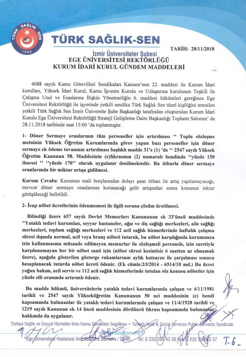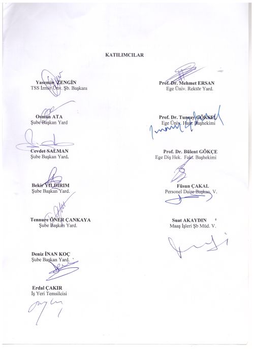 28.11.2018 tarihinde Ege Üniversitesi Rektörlüğü Strateji Geliştirme Daire Başkanlığı Toplantı Salonun’ da gerçekleşen toplantımıza Rektörlük makamını temsilen; Ege Üniversitesi Rektör Yardımcısı Prof. Dr. Mehmet ERSAN, Ege Üniversitesi Hastanesi Başhekimi Prof. Dr. Tuncay GÖKSEL, Ege Diş Hekimliği Fakültesi Başhekimi Prof. Dr. Bülent GÖKÇE, Personel Daire Başkan Vekili Füsun ÇAKAL, Maaş İşleri Şube Müdür Vekili Suat AKAYDIN Şubemizi temsilen; Şube Başkanımız Yasemin ZENGİN, Şube Başkan Yardımcılarımız Osman ATA, Cevdet SALMAN, Bekir YILDIRIM, Tennure ÖNER ÇANKAYA, Deniz İNAN KOÇ, İşyeri Temsilcimiz Erdal ÇAKIR katılım sağlamıştır.
