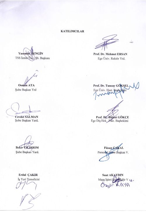 29.04.2019 tarihinde Ege Üniversitesi Rektörlüğü Strateji Geliştirme Daire Başkanlığı Toplantı Salonun’ da gerçekleşen toplantımıza Rektörlük makamını temsilen; Ege Üniversitesi Rektör Yardımcısı Prof. Dr. Mehmet ERSAN, Ege Üniversitesi Hastanesi Başhekimi Prof. Dr. Tuncay GÖKSEL, Ege Diş Hekimliği Fakültesi Başhekimi Prof. Dr. Bülent GÖKÇE, Personel Daire Başkan Vekili Füsun ÇAKAL, Maaş İşleri Şube Müdür Vekili Suat AKAYDIN Şubemizi temsilen; Şube Başkanımız Yasemin ZENGİN, Şube Başkan Yardımcılarımız Osman ATA, Cevdet SALMAN, Bekir YILDIRIM, , İşyeri Temsilcimiz Erdal ÇAKIR katılım sağlamıştır.