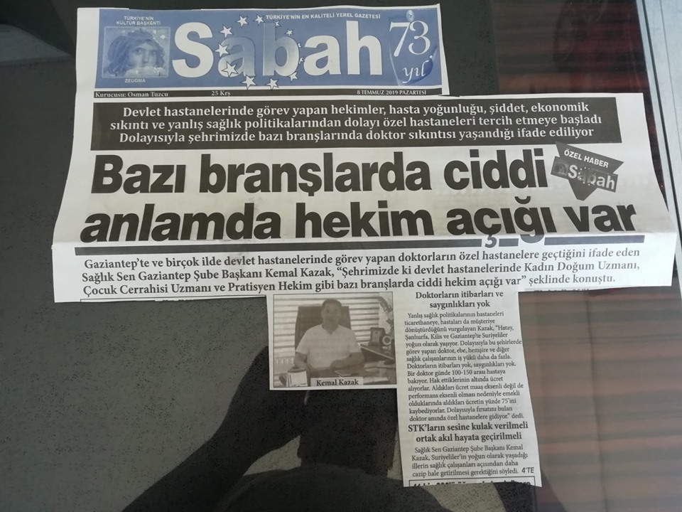 Türk Sağlık- Sen Gaziantep Şubesi olarak; kamuda hekim açığı hakkında yerel Sabah Gazetesinden Hüseyin KARATAŞ'a açıklamalarda bulunduk.