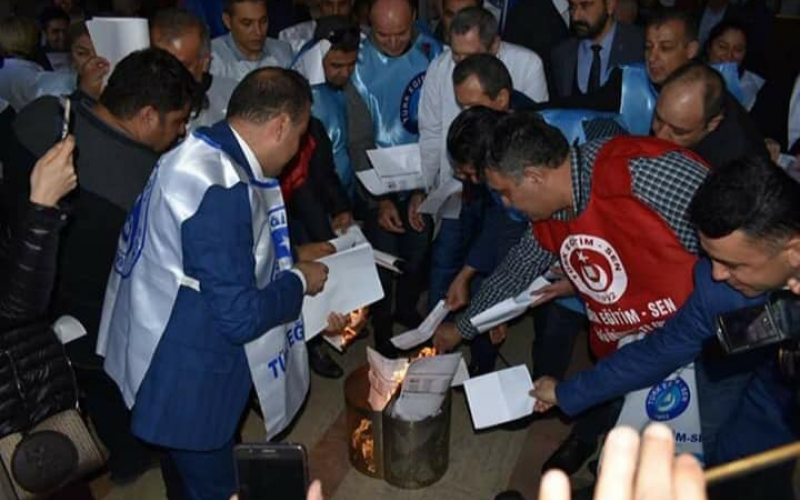 Ekonomik gerçeklerle bağdaşmayan maaş zamlarını protesto amaşlı bordro yakma eylemi için alanlardayız.