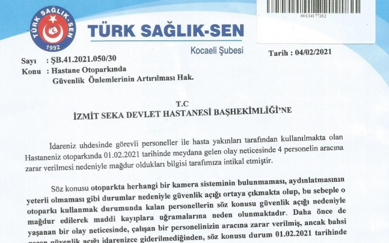 Türkiye Kamu-Sen’e Üye Türk Sağlık-Sen Kocaeli Şubesi Başkanı Ömer Çeker, İzmit Seka Devlet Hastanesi otoparkında yaşanan sorunlarla ilgili geçtiğimiz günlerde hastane yönetimine bir dilekçe verdiklerini belirttiler. Dilekçede belirtilen sorunun çözümü için hastane yönetiminin ilgili kurumlarla hemen iletişime geçmesinden dolayı sendika yönetimi olarak teşekkür ettiklerini açıkladılar. Türk Sağlık-Sen Kocaeli Şubesi Başkanı Ömer Çeker konu hakkında yaptığı açıklamasında, “İzmit Seka Devlet Hastanemizin otoparkında sağlıkçılarımızın ve hastaneye gelen vatandaşlarımızın menfur olaylara maruz kalmaları sonrasında hastane yönetimine bir dilekçe yazdık. Hastane yönetimi bu konuda hassas davranarak sorunun çözümü için gerekli kurumlarla iletişime geçtiğini belirten bir yazıyı tarafımıza ulaştırdı” dedi.