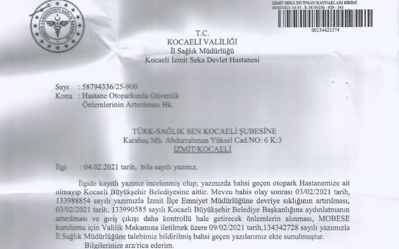 Başkan Çeker açıklamasının devamında, “ İzmit Seka Devlet Hastanesi Başhekimi Op. Dr. Sadullah Kıvanç Tunç imzalı gönderilen cevabi yazıda, konu ile ilgili hassasiyetlerini dile getirmişler. Bu konuda mevzu bahis otoparkın hastaneye değil, Kocaeli Büyükşehir Belediyesine ait olduğu belirtilmiş. Kocaeli Büyükşehir Belediyesine bölgenin aydınlatılması için yazı yazdıklarını belirttiler. Yine İzmit İlçe Emniyet Müdürlüğüne devriyelerin arttırılması için dilekçe yazdıklarını ifade ettiler. Kocaeli Valiliği makamına da bölgeye Mobese sisteminin kurulması için dilekçe yazdıklarını ifade ettiler.