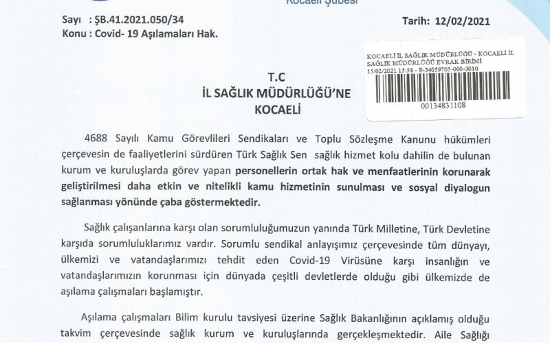 Covid-19 Aşılarının vatandaşlarımıza uygulanması esnasında yaşanan sorunların tespiti ve çözüm önerileri hakkında Türk Sağlık Sen Kocaeli Şube Aile Hekimleri Komisyonun hazırlamış olduğu rapor hakkında şube başkanı yazılı açıklama yaptı.
