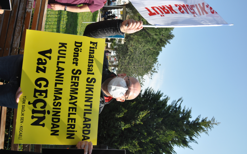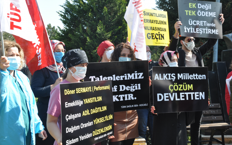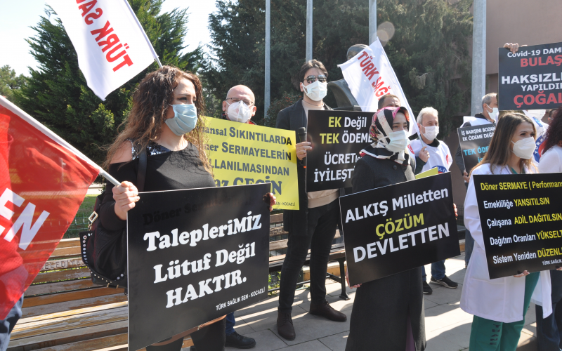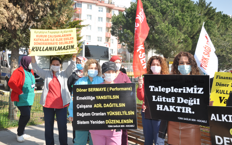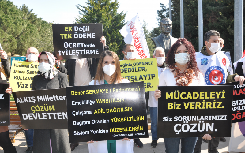 Türk Sağlık-Sen Kocaeli Şubesi Başkanı Ömer Çeker, dün S.B.Ü. Derince Eğitim ve Araştırma Hastanesi önünde gerçekleştirdiği basın açıklaması ile, sağlık çalışanlarının döner sermaye feryadını yüksek sesle dile getirdi.