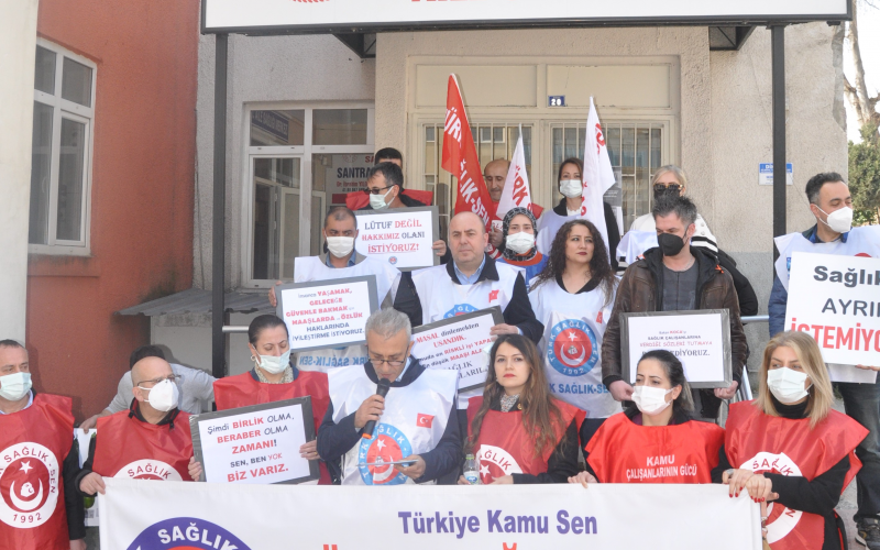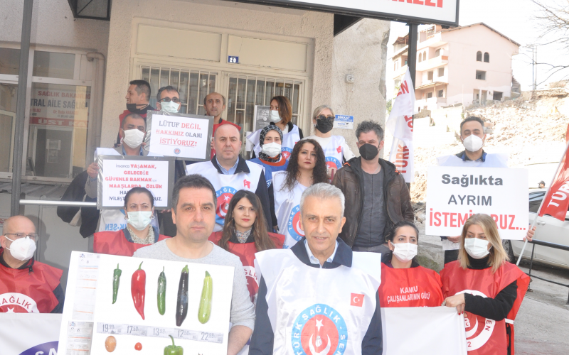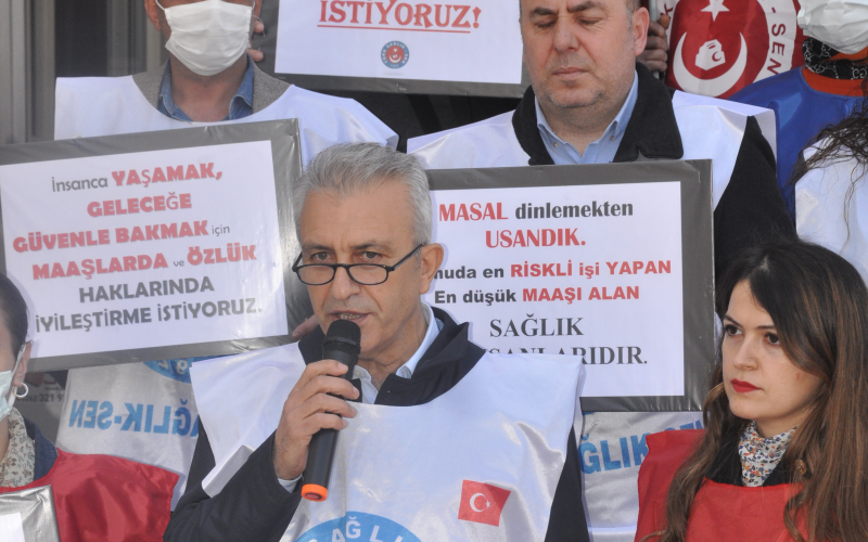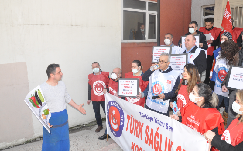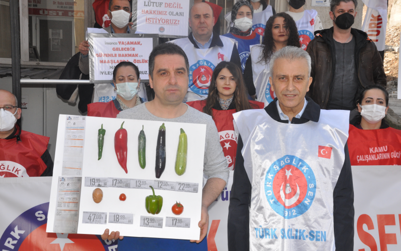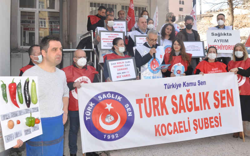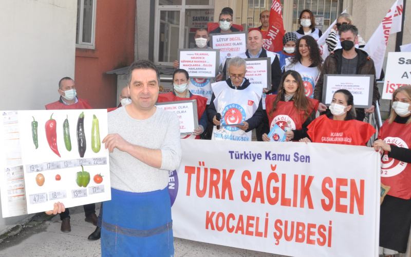 Türk Sağlık-Sen Kocaeli Şubesi Başkanı Ömer Çeker, iş bırakma eylemi nedeniyle gerçekleştirdiği basın açıklamasında, “ Sağlık çalışanları 1 saat çalışıp ancak 1 kg patlıcan alabiliyor” dedi.