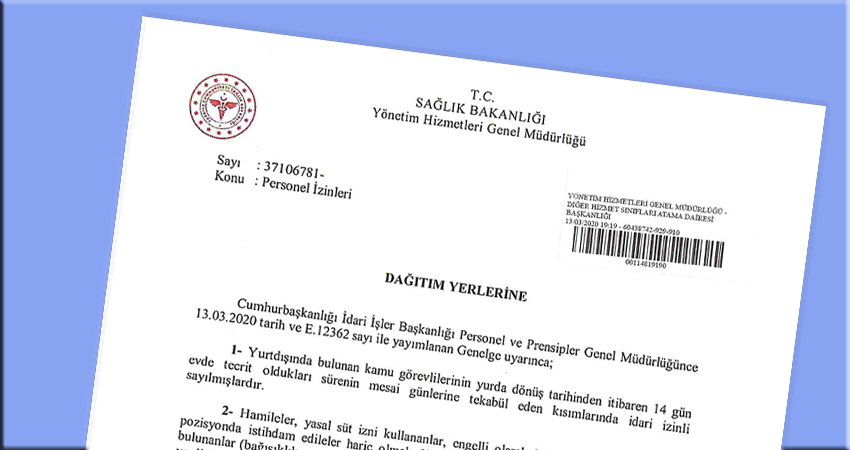 Sağlık Bakanlığı tarafından yayınlanan bir yazı ile Bakanlık merkez ve taşra teşkilatında görev yapan tüm personellerin yıllık izinlerinin ikinci bir talimata kadar durdurulduğu açıklandı.