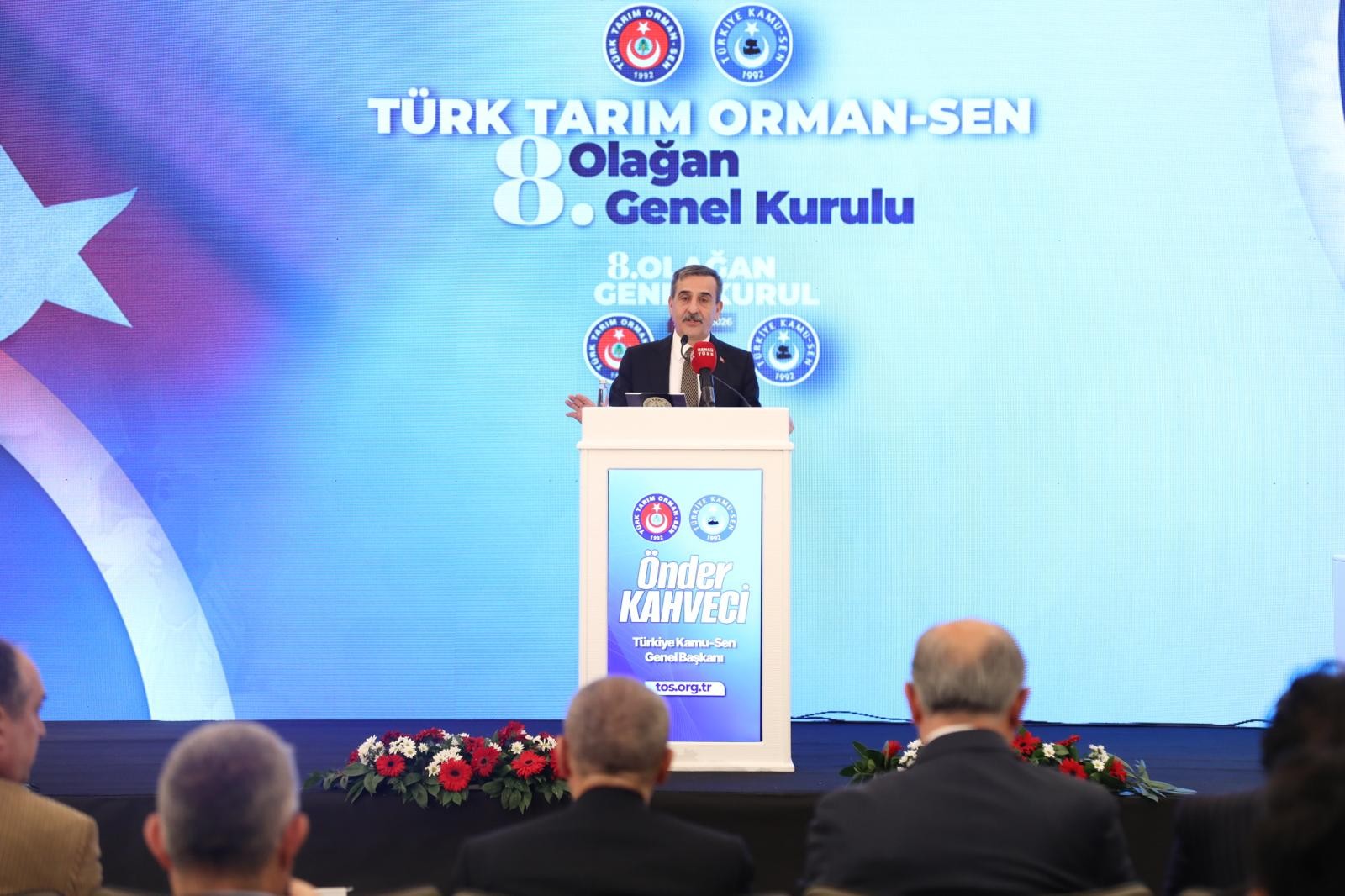 Türk Tarım Orman-Sen 8. Olağan Genel Kurulu’nda katılımcılara hitap eden Türkiye Kamu-Sen Genel Başkanımız Önder Kahveci, tarım, hayvancılık ve ormancılık hizmet kolunun stratejik önemine dikkat çekerek, bu alanda görev yapan kamu çalışanlarının milletin geleceği için hayati bir sorumluluk üstlendiğini vurguladı.