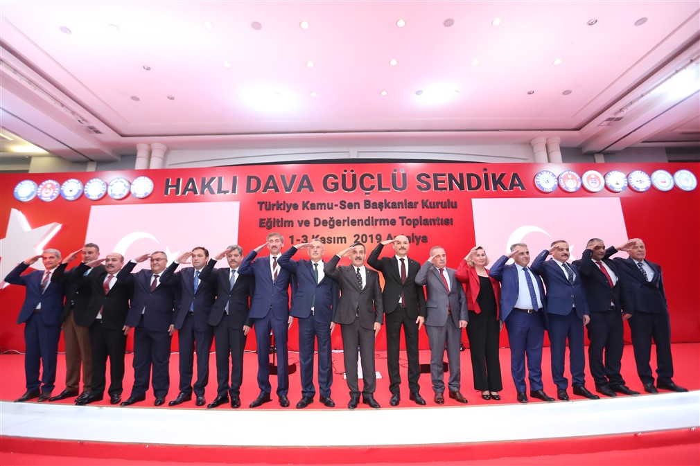 Hepimiz gördük, çatışmaya gülerek giden askerimizi görünce tüm dünya dehşete kapıldı. Kimse bilmez, bizim için zalimle cenke gitmek, düğüne gitmek gibidir. Evet; Türk olmak zordur, bütün dünyayla savaşırsın. Ama Türk olmamak daha zordur çünkü Türklerle savaşırsın. Varsa yüreği yeten gelsin, bu vatanı bölmeyi denesin. Fırat Kalkanı Harekatı’nda nasıl sırtlanlar gibi kaçtıklarını gördük. Zeytin Dalı’nda nasıl fareler gibi deliklere sindiklerini gördük. Barış Pınarı’nda nasıl dize geldiklerini gördük. Türk milleti, askeri ve devletiyle omuz omuza verdiğinde, oyunun kurallarının nasıl değiştiğini gördük. Sınırlarımızda oluşturulmak istenen terör koridorunun, kurulmak istenen terör devletinin nasıl tarihin çöplüğüne süpürüldüğünü gördük. 100 yıl önce olduğu gibi, masa başında kurulan hayallerin ömrünün, Türk askeri ile karşılaşıncaya kadar olduğunu, bir kere daha gösterdik. Bu topraklara dostluk ve kardeşlik dışında bir emelle gelenler bilsinler ki, topraklarımız geniş, bundan öncekileri olduğu gibi onları da gömecek yer buluruz. Türkiye Kamu-Sen olarak, daha kurulduğumuz ilk gün, bir ferdi olmaktan şeref duyduğumuz, büyük Türk milleti adına, hesapsız ve hiçbir karşılık beklemeden, her zaman taraf olacağımıza; “Bizim ilkemiz, önce ülkemiz” düsturuyla, tüm varlığımızla, milletimizin ve ülkemizin hizmetinde olacağımıza; İçten ve dıştan, milletimizin zararına ve devletimizin bekasına yönelik girişimlere karşı duracağımıza; Milletimizin aydınlık geleceği için varlığımızı armağan edeceğimize; Türkiye sevdalısı, milli bir sivil toplum kuruluşu olarak, camiamızın ve milletimizin sesi olacağımıza ahdetmiştik. Biz, verdiğimiz bu sözün sorumluluğu ve bilinci içinde, söz konusu vatan olduğunda, hiç tereddüt göstermeden, birliğimizi hiçbir küçük hesaba kurban etmeden, askerimizin ve devletimizin yanında olduk. Bizim yönümüz, tarafımız, safımız hiç değişmedi, değişmeyecek, değiştirmeye de kimsenin gücü yetmeyecek.