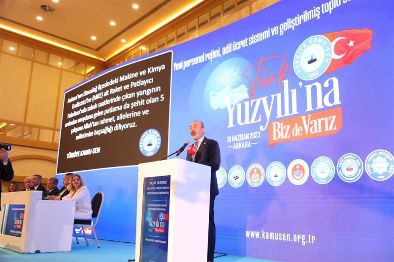 Kamuda bayram ikramiyesi alamayan tek kesim olan memurlarımızın da bu haktan faydalanmasını mutlaka ama mutlaka sağlayacağız. Yakın bir zamanda 7. Dönem Toplu Sözleşmeleri için toplu pazarlık masasına oturacağız. 2012 yılından beri, yetkili konfederasyonun bu masayı nasıl etkisiz hale getirdiğine şahitlik ediyoruz. Kamu işvereni tarafından masaya getirilen her teklifi itirazsız kabul ediyor. Ekonomik gelişmeler karşısında yetersiz kalan maaşlara hükümet, toplu sözleşme dışında ilave yapıyor ve toplu sözleşme masası hükümsüz hale geliyor. Kifayetsiz sendikalarla, 25 milyon kamu çalışanı ve ailesinin kaderini tek bir kişinin imzasına bağlayan etkisiz bir toplu pazarlık düzeni ile daha fazla devam edilemeyeceği açıktır. Bu nedenle, 4688 sayılı Kanun’da gerekli değişiklikler yapılarak toplu pazarlık sisteminin yeniden düzenlenmesi, imza ve itiraz yetkisinin tek bir kişiden alınıp, temsil kabiliyetine haiz tüm sendika ve konfederasyonlara tanınması, sendikacılığın zafiyete uğratılan itibarının yeniden kazanılması için elzemdir. Cumhuriyetimizin ikinci yüzyılında Devletimizi Türk Yüzyılı hedefimize taşıyacak yetkinliğe sahip bir kamu çalışanı görmek arzusundayız. Biz, devletle çatışmadan, milletin değerleriyle ters düşmeden ama sarı sendikacılık yapmadan da hak mücadelesi verilebileceği gerçeğiyle yola çıktık. 31 yıldır hem Türkiye Cumhuriyeti’nin varlığı ve bütünlüğü hem de milletimizin birliği ve kardeşliği için her türlü iç ve dış mihrakların karşısında olurken diğer yandan da kamu görevlilerimizin haklarının korunması ve geliştirilmesi yolunda kesintisiz, kararlı ve çetin bir mücadelenin korkusuz neferleri olduk.